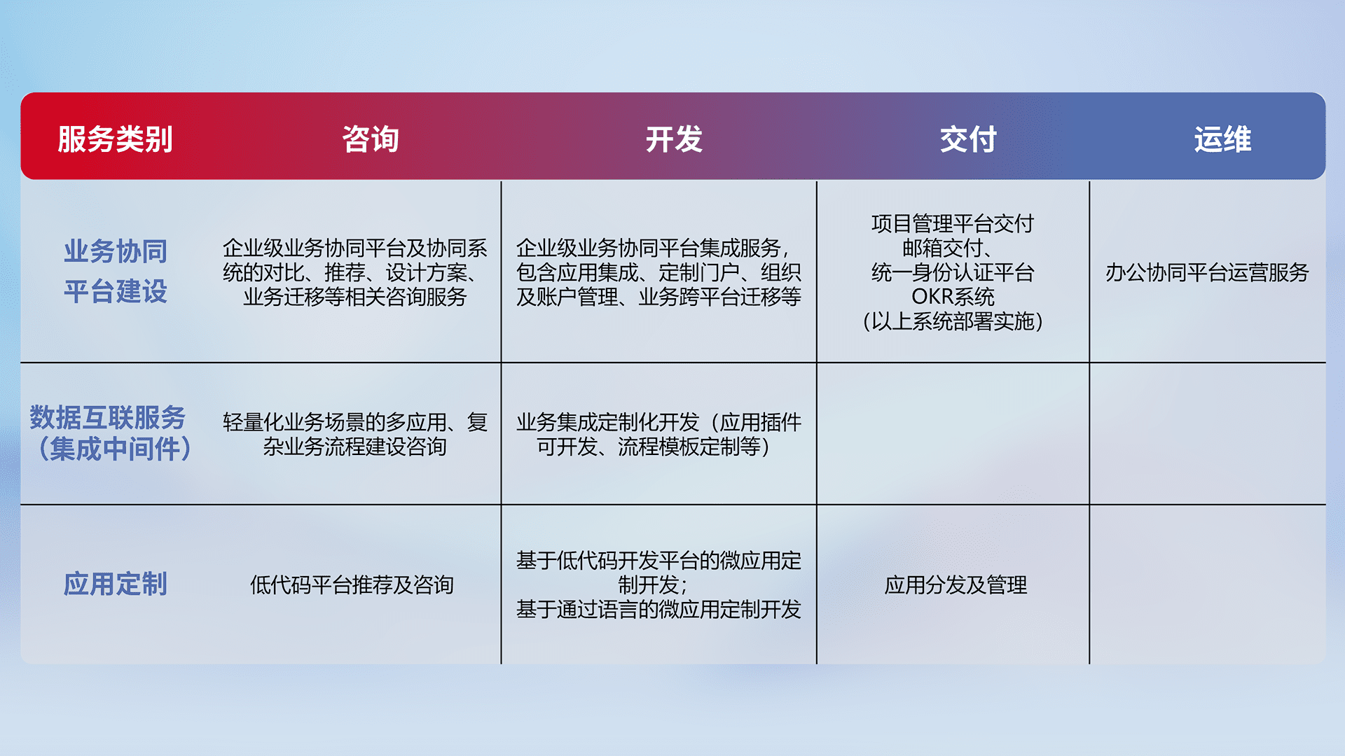 针对钉钉、、、、企微、、、、IDaas等平台级产品提供产品的规划、、、方案、、、交付、、、、定制化开发等服务,,,,实现如统一协同办公、、、智能客户服务、、、混合会议管理、、、智能数据查询、、等业务场景,,,实现数字化转型。。。