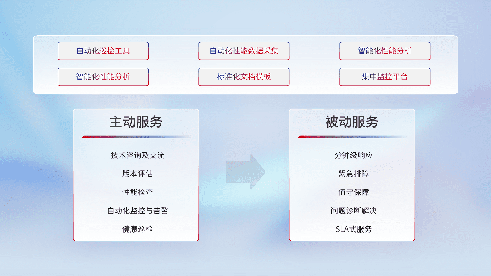 智能化工具和标准化文档,,,保障服务质量,,,,提供主动服务(包含技术咨询、、、版本评估、、、性能检查、、自动化监控与告警、、、健康巡检)和被动服务包含(分钟级响应、、紧急排障、、值守保障、、、问题诊断解决、、、、SLA服务)。。。。